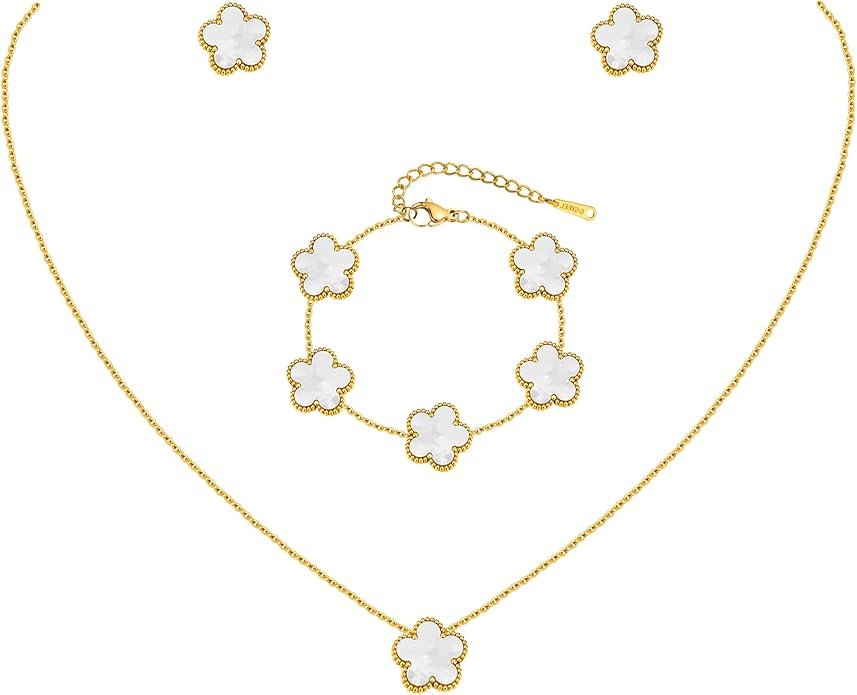 Gold necklace, bracelet, and earring set – 18K gold plated flower chain bracelet, tarnish-resistant stainless steel, jewelry set with floral pendant and earrings